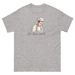 Printed on unisex cotton graphic tees for everyday wear, these “let him cook” shirts are made for casual outfits, supermarkets, gyms, group chats, and situations where someone needs to be left alone to do their thing.